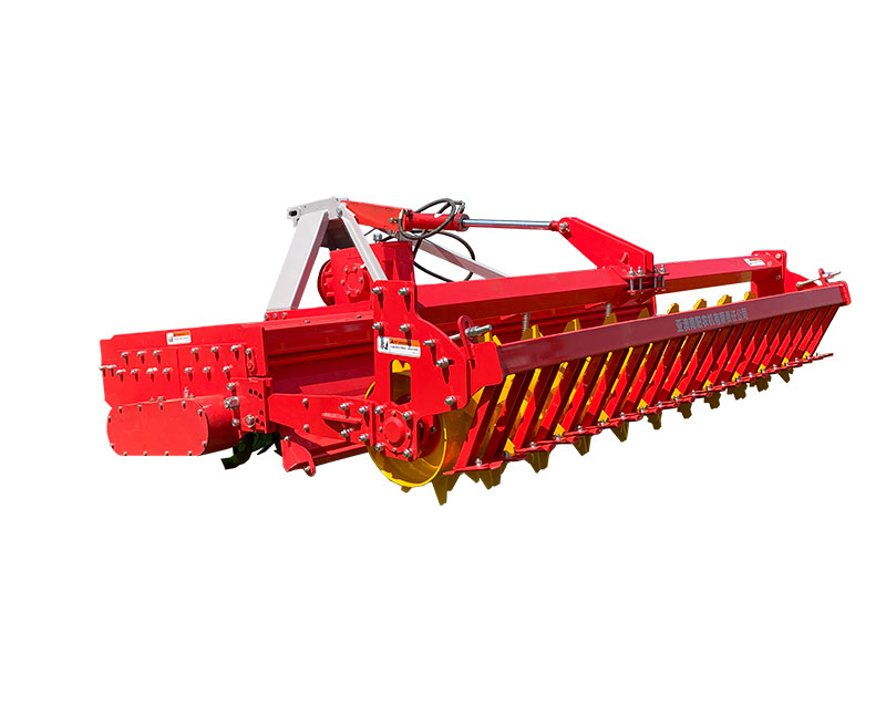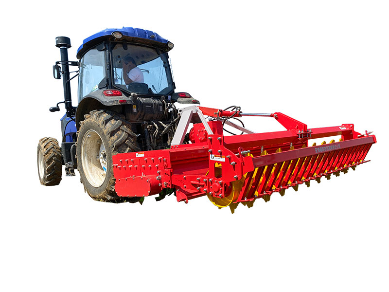 該機具主要用于旋耕整地作業(yè),農藝順序為旋耕-旋耕-鎮(zhèn)壓-拖平。專利設計,合理利用刀軸外端二次動力傳輸,帶動后刀軸工作,達到二次粉碎。機械傳動環(huán)節(jié)少,有效節(jié)省了拖拉機的馬力消耗。一遍頂兩遍的作業(yè)模式,大大提高工作效率。前刀軸和后刀軸連續(xù)作業(yè),拖板鎮(zhèn)壓拖平,提高作業(yè)質量。