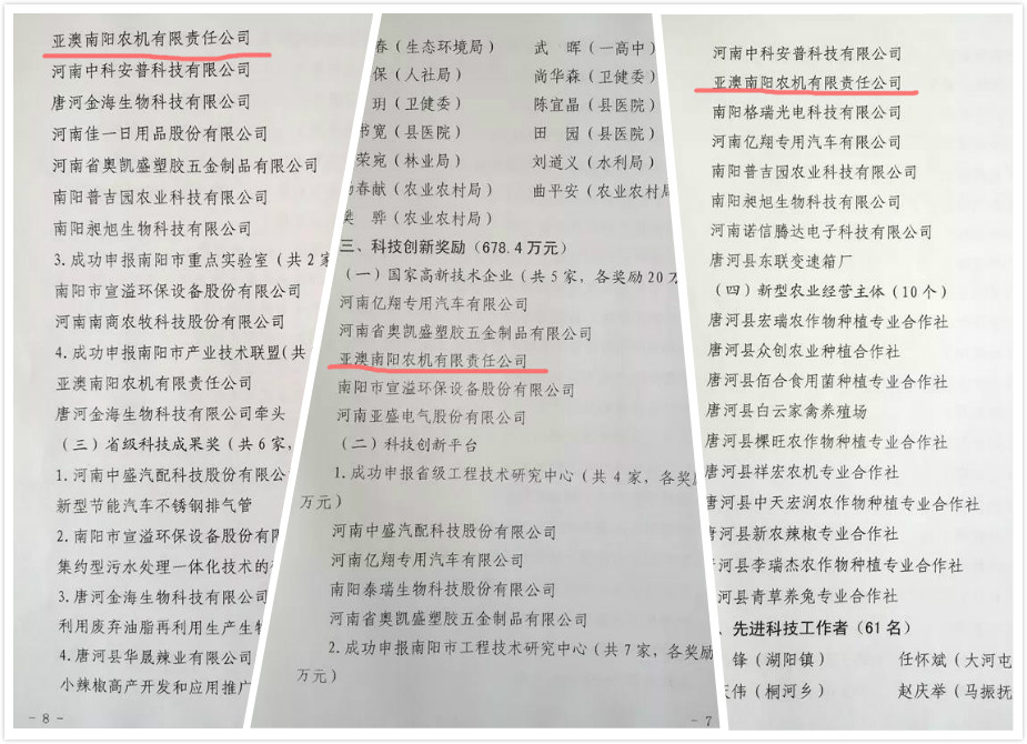 亞澳農(nóng)機(jī)共獲得政府獎(jiǎng)勵(lì)35萬元。包括成功申報(bào)國家高新技術(shù)企業(yè)20萬元獎(jiǎng)勵(lì)、市級(jí)工程技術(shù)研究中心5萬元獎(jiǎng)勵(lì)、南陽市產(chǎn)業(yè)技術(shù)聯(lián)盟10萬元獎(jiǎng)勵(lì)10萬元。