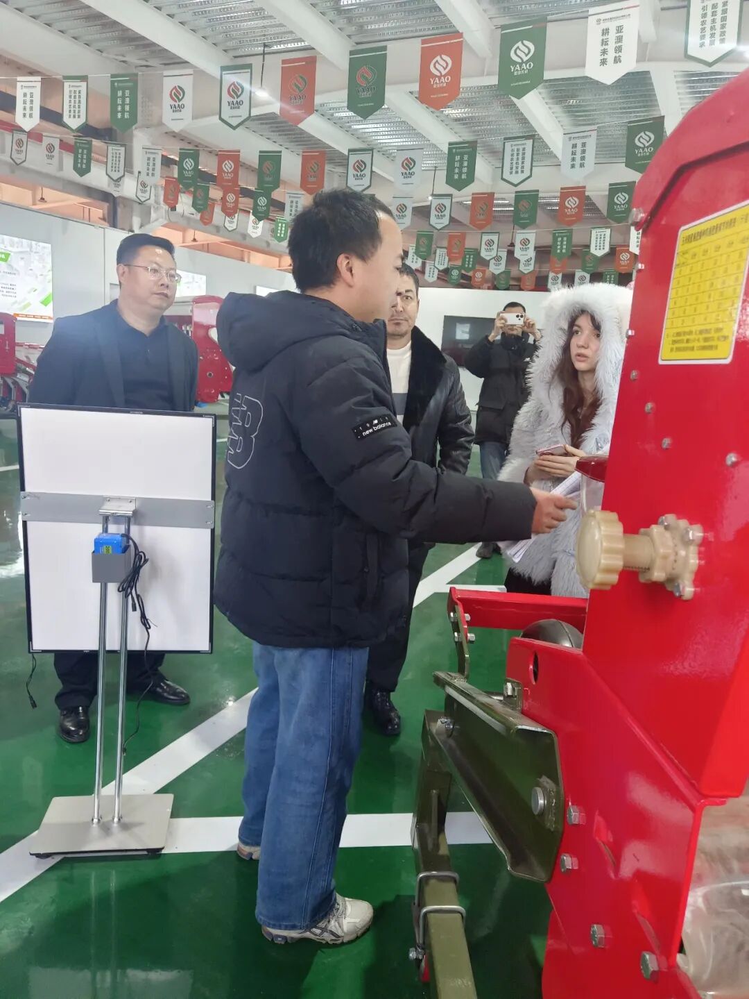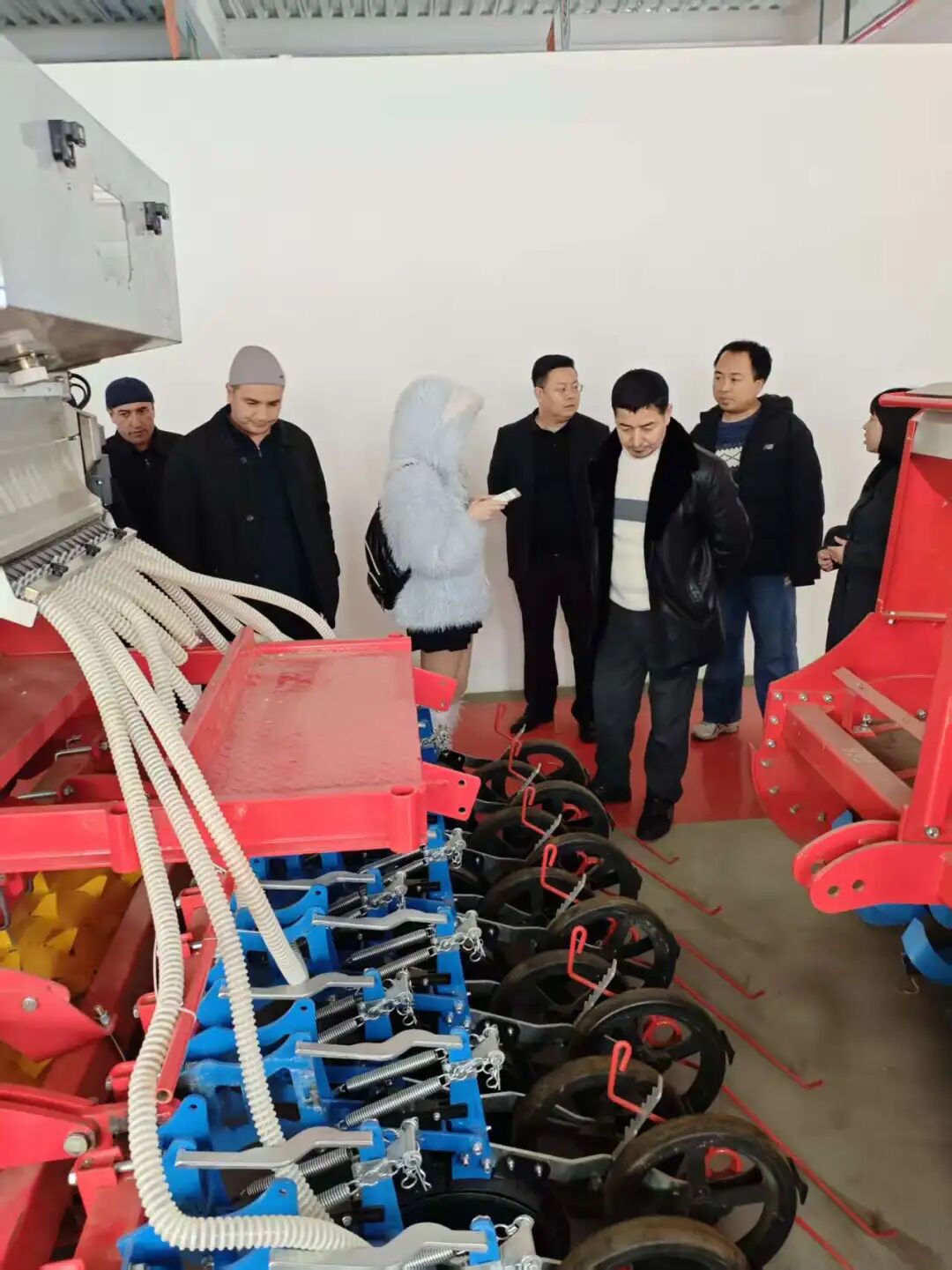 在產(chǎn)品展廳,亞澳農(nóng)機負(fù)責(zé)外貿(mào)的時馳經(jīng)理詳細(xì)介紹了公司的核心技術(shù)與產(chǎn)品優(yōu)勢。針對代表團關(guān)注的氣吸式播種機,重點演示了其核心優(yōu)勢:搭載進口指夾式排種器,播種精度高達95%以上,遠超國家標(biāo)準(zhǔn);創(chuàng)新采用梯堵裝置等專利技術(shù),可實現(xiàn)旋耕、整地、播種、施肥一體化作業(yè),適配干旱與黏濕等多種土壤環(huán)境,且能根據(jù)需求定制雙苗帶機型,完全契合烏茲別克斯坦的棉花種植需求?!拔覀兊漠a(chǎn)品在國內(nèi)小麥、玉米主產(chǎn)區(qū)可實現(xiàn)畝均增產(chǎn)10%-15%,作業(yè)成本降低30%以上,相信在烏茲別克斯坦也能發(fā)揮同樣的效益。”時馳經(jīng)理的介紹讓代表團成員頻頻點頭。
